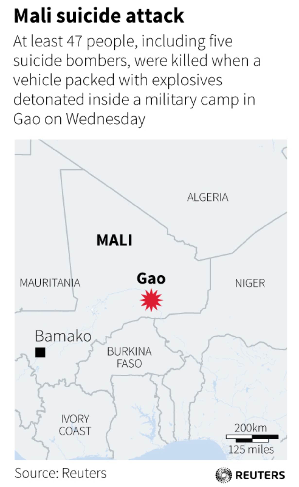 Before Wednesday's blast, the worst militant attack on the former French colony was a November 2015 assault by jihadist gunmen on a Radisson hotel in the capital, Bamako, in which 20 people were killed.