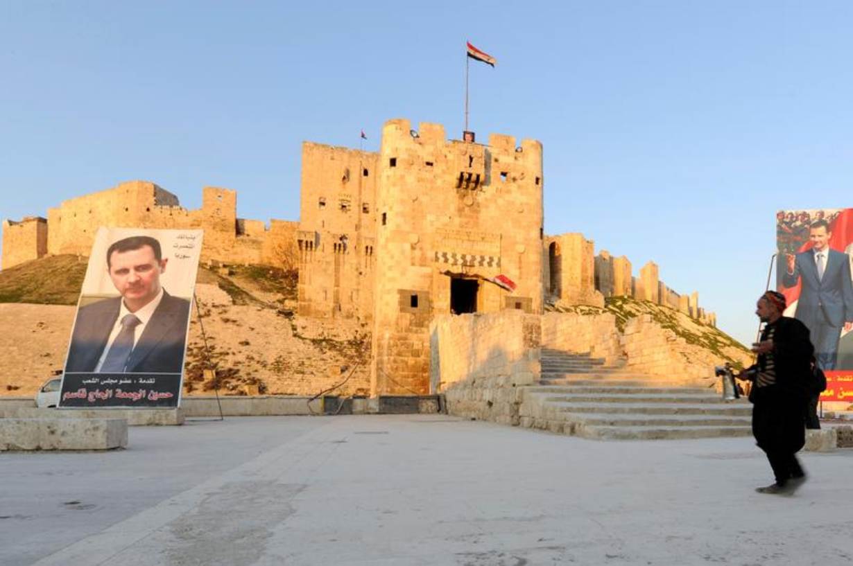At the top of the sloping causeway leading up to the Citadel's entrance, wide enough for horses to ride abreast, four soldiers scrolled through their phones under posters of Assad.
