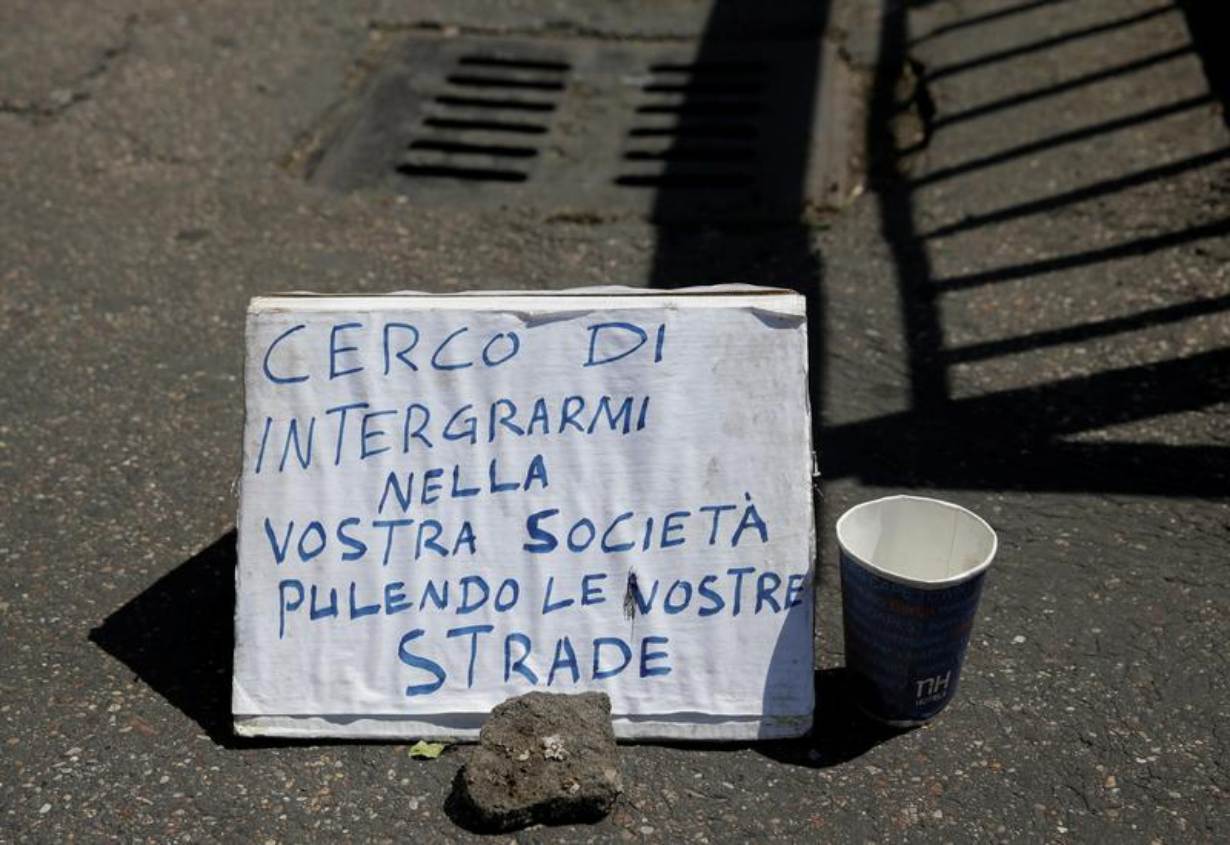 "I am trying to integrate into your society by cleaning our streets," reads a small cardboard sign he has placed next to a paper cup, hoping for donations from appreciative Romans.