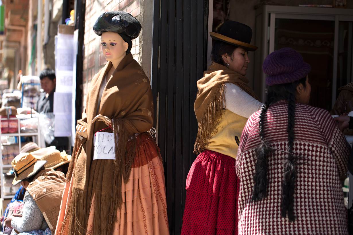 While she speaks Spanish rather than Aymara in public and wears black stilettos and trousers instead of the traditional bowler hats and colourful, layered skirts, many indigenous women identify with her, calling her "brave".