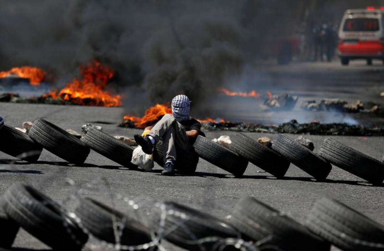 With Israeli tear gas rising into the air, Palestinian youths used T-shirts, cheap medical masks and perfume to try and protect themselves. Israel tried to douse the burning rubber with jets of water directed over defensive dirt mounds on its side of the border.