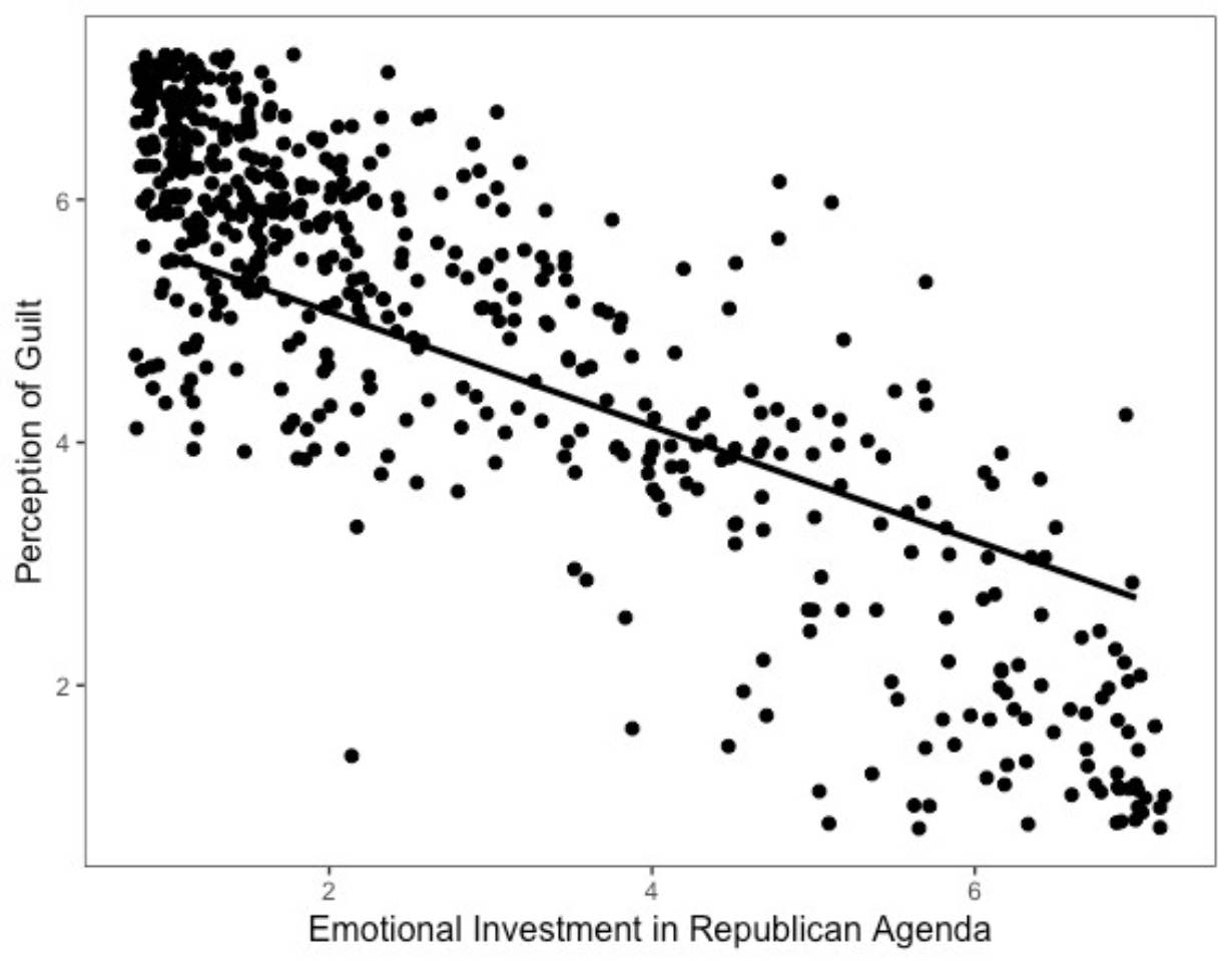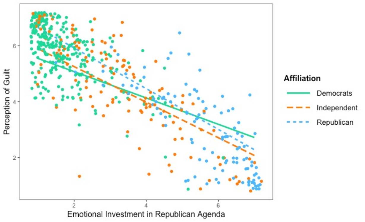People who are emotionally invested in Republicans succeeding are more likely to think Kavanaugh is innocent. On the flipside, people who are emotionally invested in Democrats succeeding are more likely to think Kavanaugh is guilty. This is controlling for perceptions of evidence, demographics, and hostile sexism (which also predicts perceptions of guilt).