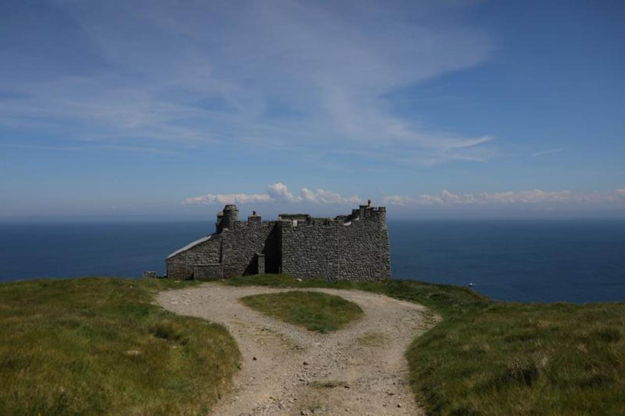 After taking communion under the dull light of a stained-glass window, visitors leave the church in twos, walking along a rock wall that crisscrosses the island. Follow it north and the village turns to open fields and skies. A shell of an old quarry hospital stands on a cliff. All that remains are the crumbling stone walls, its roof long gone. Thin feathers of clouds float high above, providing little shelter from the sun.
