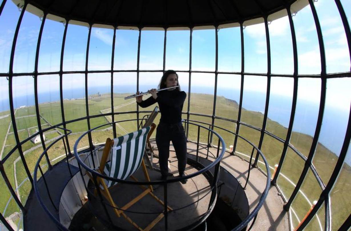 Byrne is staying in a cottage that was originally built for the keeper of a stone lighthouse in 1820. On evenings and in between cloud workshops, she climbs the spiral stairs to the top of the lighthouse to practice her flute. As she plays, she can see the old cemetery below, where early Christian burial stones sit side by side with the gravestones of a later clan that used to own the island. A stone cross covered in a web of lichen bears the inscriptions of one of them, the Rev. Hudson Heaven.