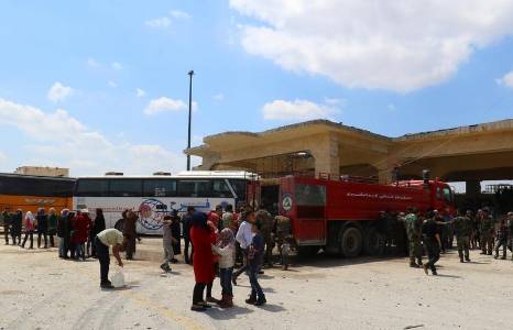 More than 35 busloads of civilians and pro-government fighters from the towns of al-Foua and Kefraya in Idlib province arrived in Aleppo city