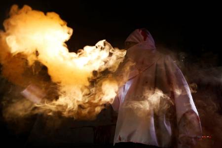 An activist from the group Chok3 performs with smoke during a protest against the constant discrimination and violence against the gay community in Chechnya and other regions of Russia, outside the Russian embassy in Mexico City, Mexico April 20, 2017. REUTERS/Carlos Jasso