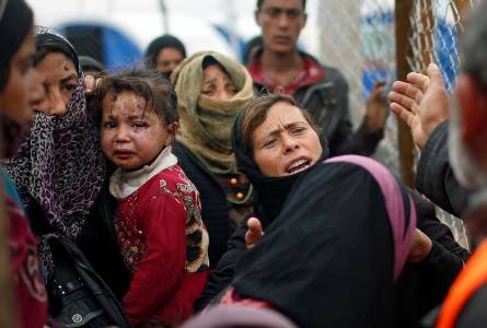 Families streamed out of the Iraqi city in an ongoing exodus of people fleeing in their thousands each day, headed for cold, crowded camps or to stay with relatives