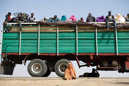 Refugees rest on, under and next to a truck in the Muna Garage area on the outskirts of Maiduguri, Nigeria