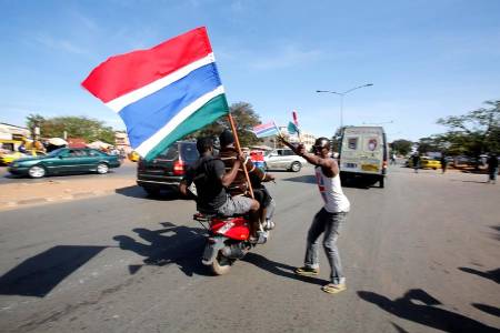 Gambians wearing T-shirts with Barrow's picture blew whistles, banged drums and sang "We welcome you our president, our hope, our solution"