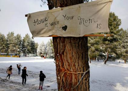 A banner that reads "Home is where your mom is" is attached to a tree at a refugee camp north of Athens as stranded Syrian refugee children play with snow January 10, 2017.REUTERS/Yannis Behrakis