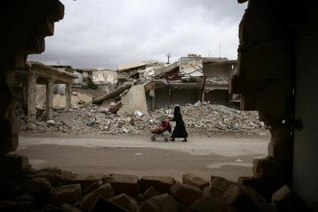 A woman pushes a baby trolley past damaged buildings in the rebel held besieged city of Douma, in the eastern Damascus suburb of Ghouta, Syria January 8, 2017. REUTERS/Bassam Khabieh
