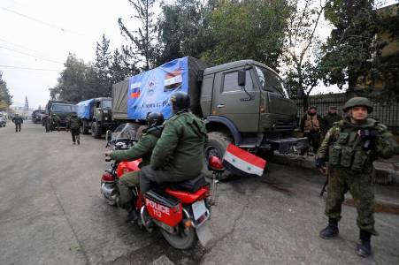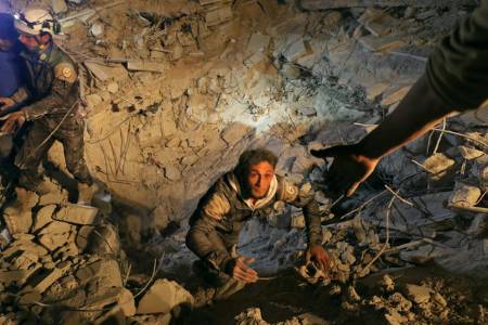 A civil defence member attempts to get out of a site hit at night by an airstrike in Saraqeb, in rebel-held Idlib province, Syria December 11, 2016.