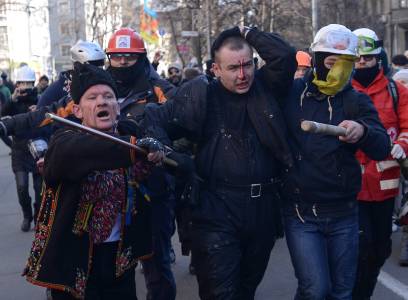 Anti-government protesters escort an unidentified man during clashes with Interior Ministry members in Kiev