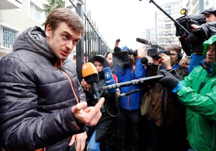 Verzilov, husband of protest group Pussy Riot band member Tolokonnikova, speaks to journalists in front of a police station in Adler during 2014 Sochi Winter Olympics