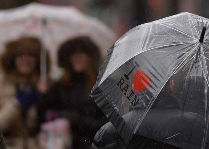 People shelter under umbrellas in central London February 18, 2014. British ministers met representatives of the insurance industry on Tuesday who briefed them on their progress in dealing with victims of winter floods across southern England. REUTERS/Toby Melville (BRITAIN - Tags: ENVIRONMENT POLITICS BUSINESS)