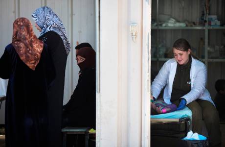 A Syrian woman carries her child past a member of the Israeli military medical team at a military hospital, where Syrians who were injured in the ongoing Syrian civil war are treated, in the Israeli-occupied Golan Heights, close to the ceasefire line between Israel and Syria February 18, 2014. REUTERS/Menahem Kahana/Pool (POLITICS MILITARY CIVIL UNREST CONFLICT)
