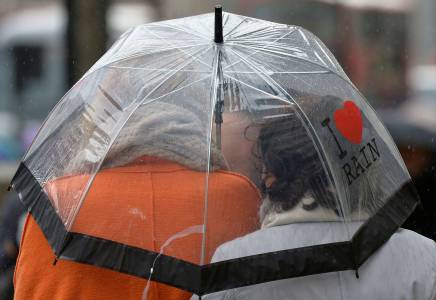People shelter under a umbrella in central London February 18, 2014. British ministers met representatives of the insurance industry on Tuesday who briefed them on their progress in dealing with victims of winter floods across southern England. REUTERS/Toby Melville (BRITAIN - Tags: ENVIRONMENT POLITICS BUSINESS)