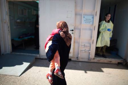 A Syrian woman carries her child past a member of the Israeli military medical team at a military hospital in the Israeli-occupied Golan Heights