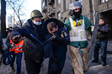 Anti-government protesters escort an Interior Ministry member (C) during clashes in Kiev February 18, 2014. Several thousand anti-government protesters clashed with police near Ukraine's parliament on Tuesday, torching vehicles and hurling stones in the worst violence to rock the capital Kiev in more than three weeks. REUTERS/Andrew Kravchenko/Pool (UKRAINE - Tags: POLITICS CIVIL UNREST)
