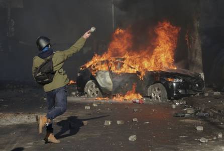 A protester throws stones as a vehicle is on fire during clashes with police in Kiev