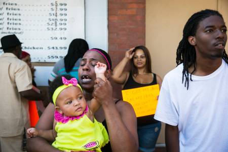 Hicks holds the hand of Jackson as she joins crowd in protesting shootings by St. Louis Police at the scene where, according to local media, police shot dead a 23-year-old man wielding a knife in the St Louis area