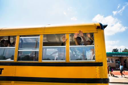 A school bus full of children gesture and chant "hands up, don't shoot" as they drive past the scene of where, according to local media, police shot dead a 23-year-old man wielding a knife in the St Louis area August 19, 2014. The shooting follows a night where dozens of people had been arrested, marking the latest outbreak of rancor in the St. Louis suburb where calls for peaceful protests have been overshadowed by episodes of looting, arson and clashes with police over the last 10 days. REUTERS/Lucas Jackson (UNITED STATES - Tags: CIVIL UNREST CRIME LAW EDUCATION)