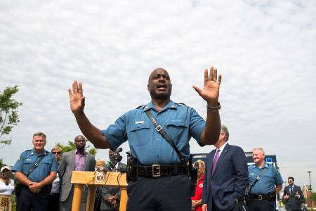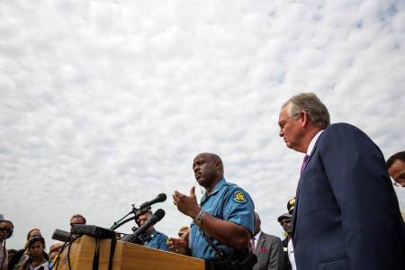 Captain Ron Johnson (C) of the Missouri Highway Patrol speaks beside Missouri Governor Jay Nixon (R) as he addresses the media following an announcement that officer Darren Wilson had been involved in the shooting of teen, Michael Brown, in Ferguson, Missouri August 15, 2014. Police named Wilson as the officer who shot and killed unarmed black teenager Brown in Ferguson, Missouri, and said the youth was the key suspect in a robbery that occurred minutes before the shooting, which sparked days of sometimes violent protests. REUTERS/Lucas Jackson (UNITED STATES - Tags: CIVIL UNREST CRIME LAW POLITICS)