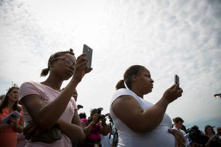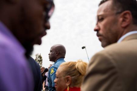 Members of the community listen to Missouri Governor Jay Nixon (not seen) as he addresses the media following an announcement that officer Darren Wilson had been involved in the shooting of teen, Michael Brown, in Ferguson, Missouri August 15, 2014. Police named Wilson as the officer who shot and killed unarmed black teenager Brown in Ferguson, Missouri, and said the youth was the key suspect in a robbery that occurred minutes before the shooting, which sparked days of sometimes violent protests. REUTERS/Lucas Jackson (UNITED STATES - Tags: CIVIL UNREST CRIME LAW)