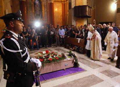 The coffin of Associated Press video journalist Camilli is seen during his funeral ceremony at the Pitigliano Cathedral in Tuscany