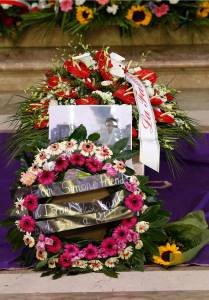 A wreath dedicated to Associated Press video journalist Camilli is seen during his funeral ceremony at the Pitigliano Cathedral in Tuscany