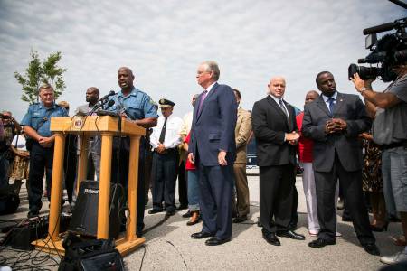 Captain Ron Johnson (3rd L) of the Missouri Highway Patrol speaks beside Missouri Governor Jay Nixon (C) as he addresses the media following an announcement that officer Darren Wilson had been involved in the shooting of teen, Michael Brown, in Ferguson, Missouri August 15, 2014. Police named Wilson as the officer who shot and killed unarmed black teenager Brown in Ferguson, Missouri, and said the youth was the key suspect in a robbery that occurred minutes before the shooting, which sparked days of sometimes violent protests. REUTERS/Lucas Jackson (UNITED STATES - Tags: CIVIL UNREST CRIME LAW POLITICS)