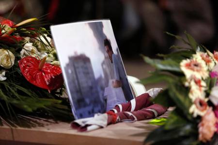 A picture of Associated Press video journalist Camilli is seen during his funeral ceremony at the Pitigliano Cathedral in Tuscany