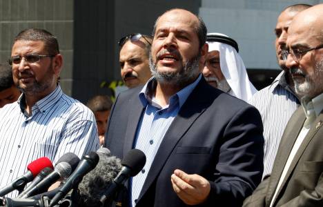 Senior Hamas leader Khalil al-Hayya (C) speaks to the media upon his return to Gaza City from truce talks in Cairo August 14, 2014. A renewed truce between Israel and Hamas appeared to be holding on Thursday despite a shaky start, after both sides agreed to give Egyptian-brokered talks more time to try to end the Gaza war. REUTERS/Ahmed Zakot (GAZA - Tags: POLITICS CIVIL UNREST)
