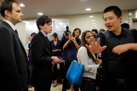 A policeman tries to stop a journalist from photographing as Harvey Humphrey (2nd L), son of British investigator Peter Humphrey (not pictured), waits to pass a metal detector at the entrance of the Shanghai No.1 Intermediate People's Court after a break during his father's trial in Shanghai August 8, 2014. Chinese prosecutors on Friday charged Humphrey and his American wife Yu Yingzeng with illegally obtaining private information in a case that could be key to a bribery investigation against GlaxoSmithKline Plc. Humphrey and Yu ran risk consultancy ChinaWhys, whose clients included GSK, and their testimony is being closely watched for any comments on the British drugmaker. REUTERS/Carlos Barria (CHINA - Tags: CRIME LAW HEALTH BUSINESS)