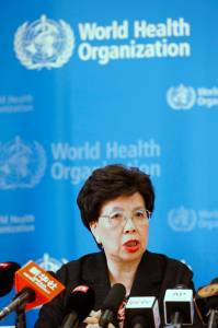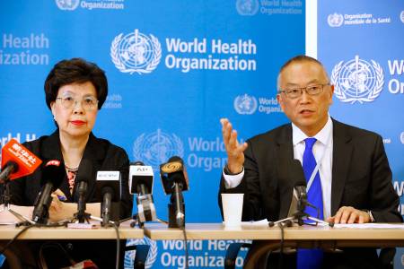 WHO Director-General Margaret Chan sits next to Fukuda, WHO's assistant director general for health security, as he addresses the media in Geneva
