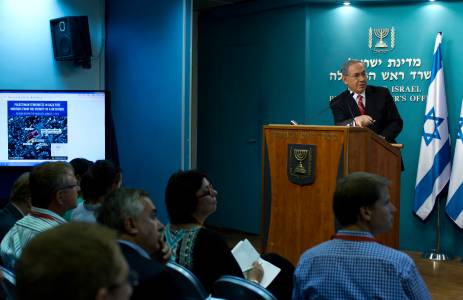 Israel's Prime Minister Benjamin Netanyahu (top right) speaks to members of the media during a news conference in Jerusalem August 6, 2014. A Gaza ceasefire was holding on Wednesday as Egyptian mediators pursued talks with Israeli and Palestinian representatives on an enduring end to a war that has devastated the Islamist Hamas- dominated enclave. REUTERS/Jim Hollander/Pool (JERUSALEM - Tags: POLITICS CONFLICT CIVIL UNREST)