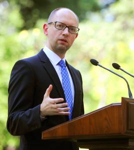 Ukraine's Prime Minister Arseny Yatseniuk speaks to the media in Kiev July 31, 2014. Ukrainian parliament rejected Prime Minister Arseny Yatseniuk's resignation on Thursday after approving legislation he said was needed to boost spending on the army and avoid a default. REUTERS/Andrew Kravchenko/Pool (UKRAINE - Tags: POLITICS CIVIL UNREST)