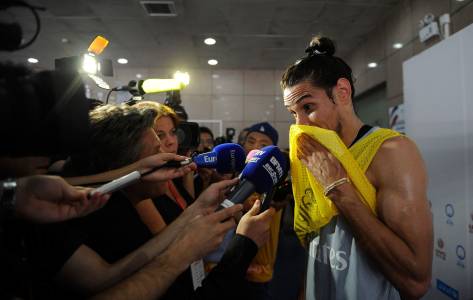PSG's Cavani talks to media after a training session in Beijing