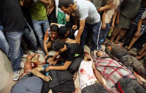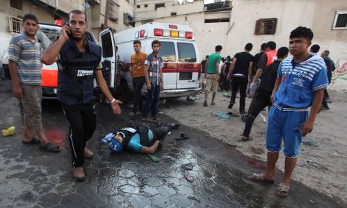 Palestinians mourn over the body of a local Palestinian journalist as people gather around bodies of other Palestinians, whom medics said were killed by Israeli shelling near a market in Shejaia, at a hospital in Gaza City