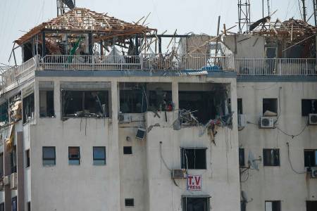 Damage is seen at Hamas' Al-Aqsa TV office in a building that houses other media offices, which witnesses said was hit in an Israeli air strike, in Gaza City
