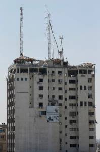 Damage is seen at Hamas' Al-Aqsa TV office in a building that houses other media offices, which witnesses said was hit in an Israeli air strike, in Gaza City July 29, 2014. Israel's military pounded targets in the Gaza Strip on Tuesday after Prime Minister Benjamin Netanyahu said his country should prepare for a long conflict in the Palestinian enclave, squashing any hopes of a swift end to 22 days of fighting. Hamas said its broadcast outlets Al-Aqsa TV and Al-Aqsa Radio were also targeted. The television station continued to broadcast but the radio station went silent. Israel launched its offensive on July 8 saying it wanted to halt rocket attacks by Hamas and its allies. REUTERS/Suhaib Salem (GAZA - Tags: POLITICS CIVIL UNREST MEDIA)