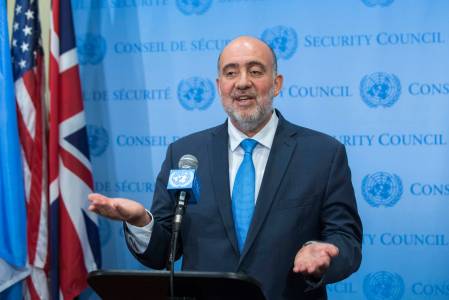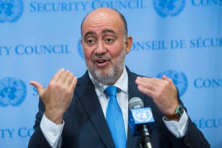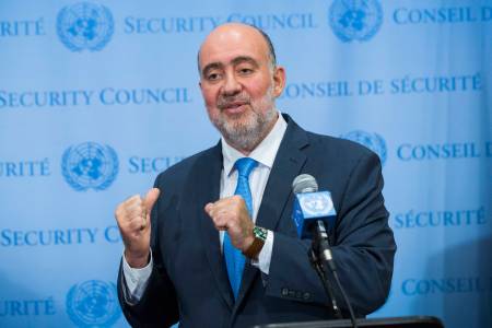 Palestinian U.N. Ambassador Mansour speaks to the media at U.N. headquarters in New York