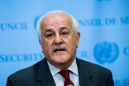 Palestinian U.N. Ambassador Mansour speaks to the media at the U.N. headquarters in New York