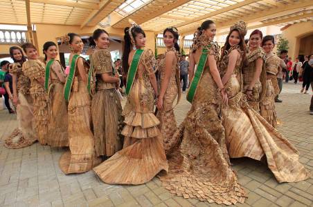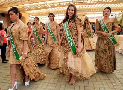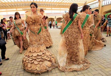 Candidates of the Miss Las Pinas Water Lily beauty pageant pose with their gowns made from dried water lilies during a media presentation in Las Pinas city