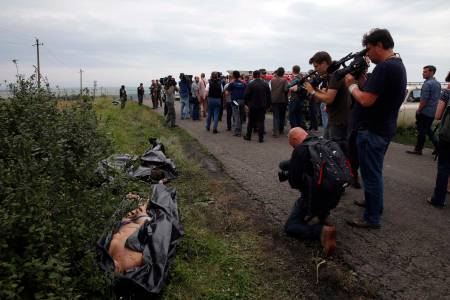Journalists and OSCE monitors work at the crash site of Malaysia Airlines Flight MH17, near the settlement of Grabovo