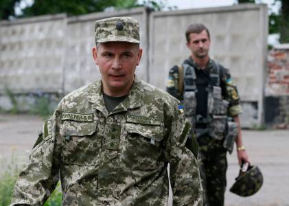 Ukraine's Defence Minister Colonel General Heletey speaks to journalists in the eastern Ukrainian town of Kramatorsk