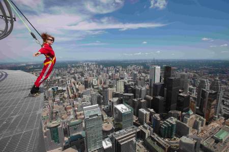 A reporter leans over the edge of the catwalk during the media preview for the "EdgeWalk" on the CN Tower in Toronto in this July 27, 2011, file photo. Toronto is best visited between May and September, when it is awash with festivals and events, and patios are jammed with locals enjoying a long-awaited outdoor pint. REUTERS/Mark Blinch/Files (CANADA - Tags: SOCIETY MEDIA CITYSCAPE TRAVEL)