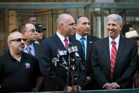 Long Island Rail Road union chief negotiator Anthony Simon (C) speaks to the media before meetings with the Metropolitan Transportation Authority (MTA) at the offices of New York Governor Andrew Cuomo in Midtown Manhattan in New York July 17, 2014. Cuomo took the lead on Thursday in talks aimed at averting a strike on the Long Island Rail Road, the nation's busiest commuter railway. Three days before the threatened walkout at 12:01 a.m. EDT (0401 GMT) on Sunday, Cuomo called a meeting in his New York office between the Metropolitan Transportation Authority (MTA) and union bosses representing 5,400 rail workers. REUTERS/Brendan McDermid (UNITED STATES - Tags: TRANSPORT CIVIL UNREST BUSINESS EMPLOYMENT POLITICS)