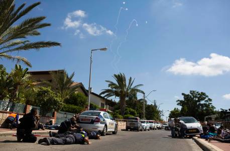 Israeli police and members of the media take cover as a siren sounds to warn of incoming rockets while interceptions by the Iron Dome anti-missile system are seen overhead in Ashkelon