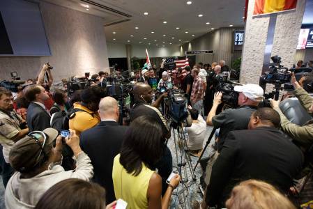 Florida teenager Tariq Khdeir is surrounded by members of the media after his arrival from Israel at Tampa airport